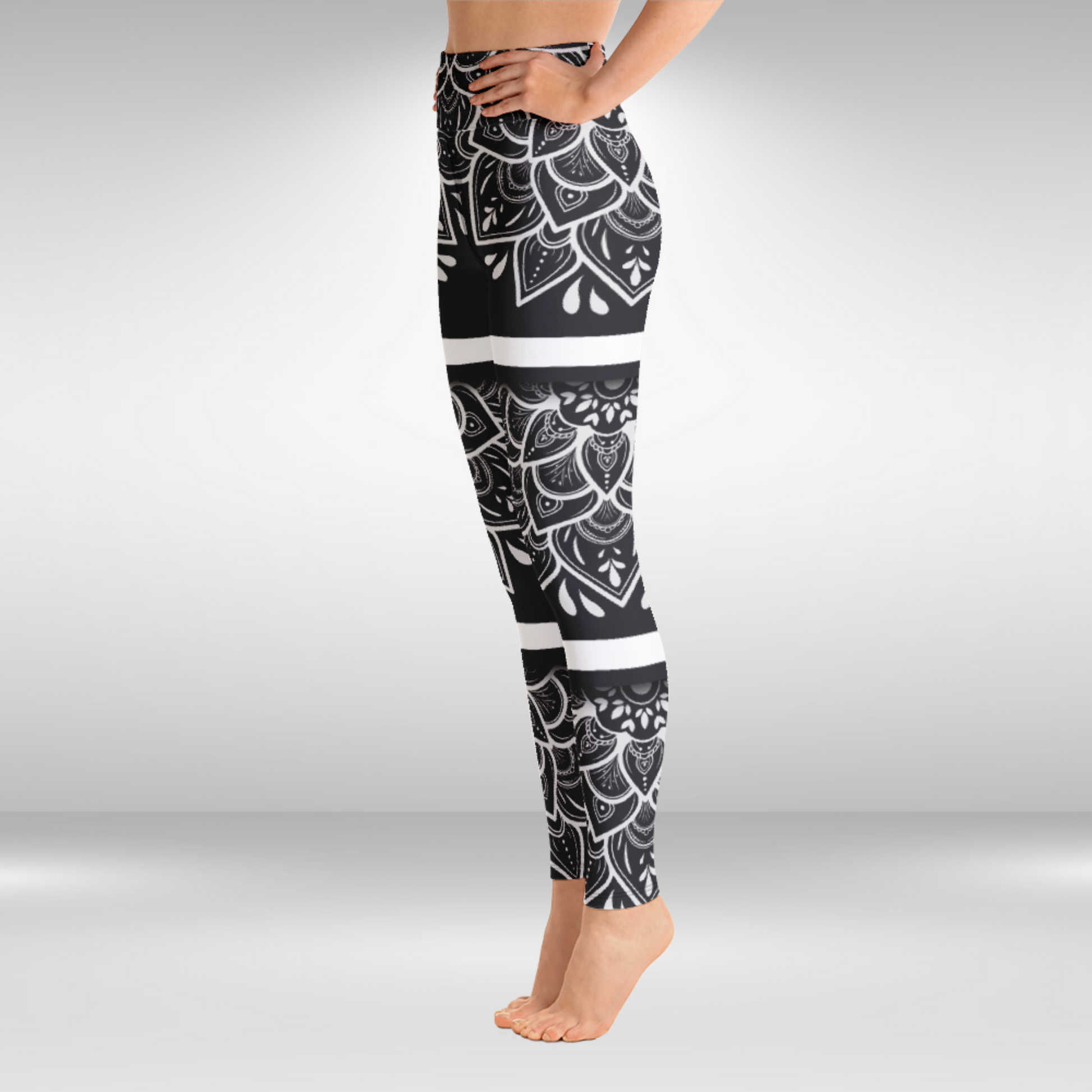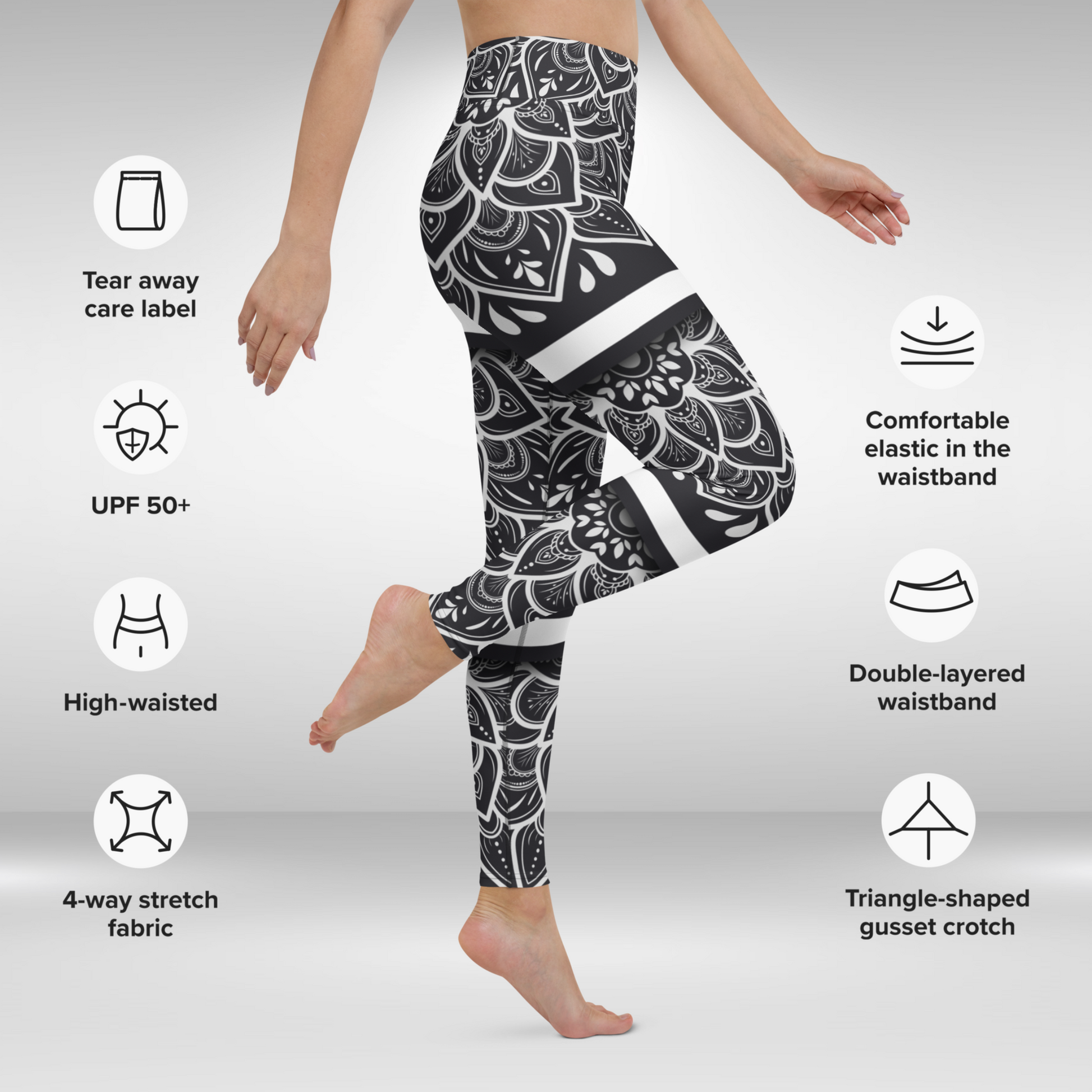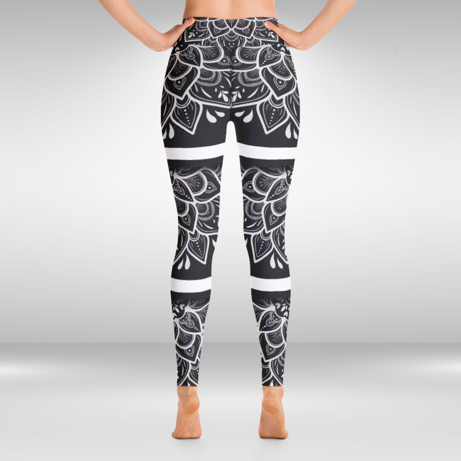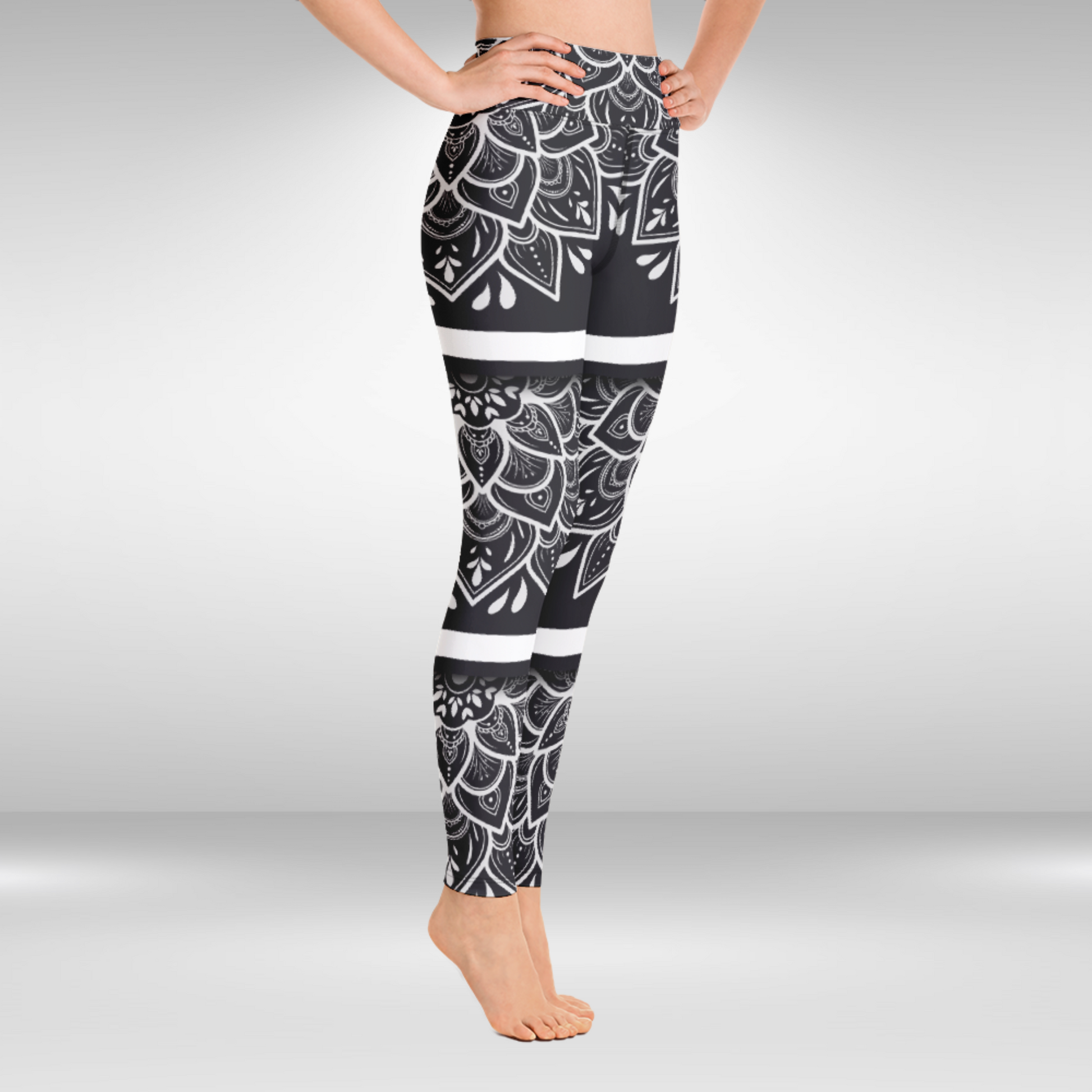 The white mandala design makes these high-rise yoga leggings pop, while the four-way stretch provides total comfort when on the move. Super soft, stretchy, and comfortable yoga leggings. Order these to make sure your next yoga session is the best one ever!