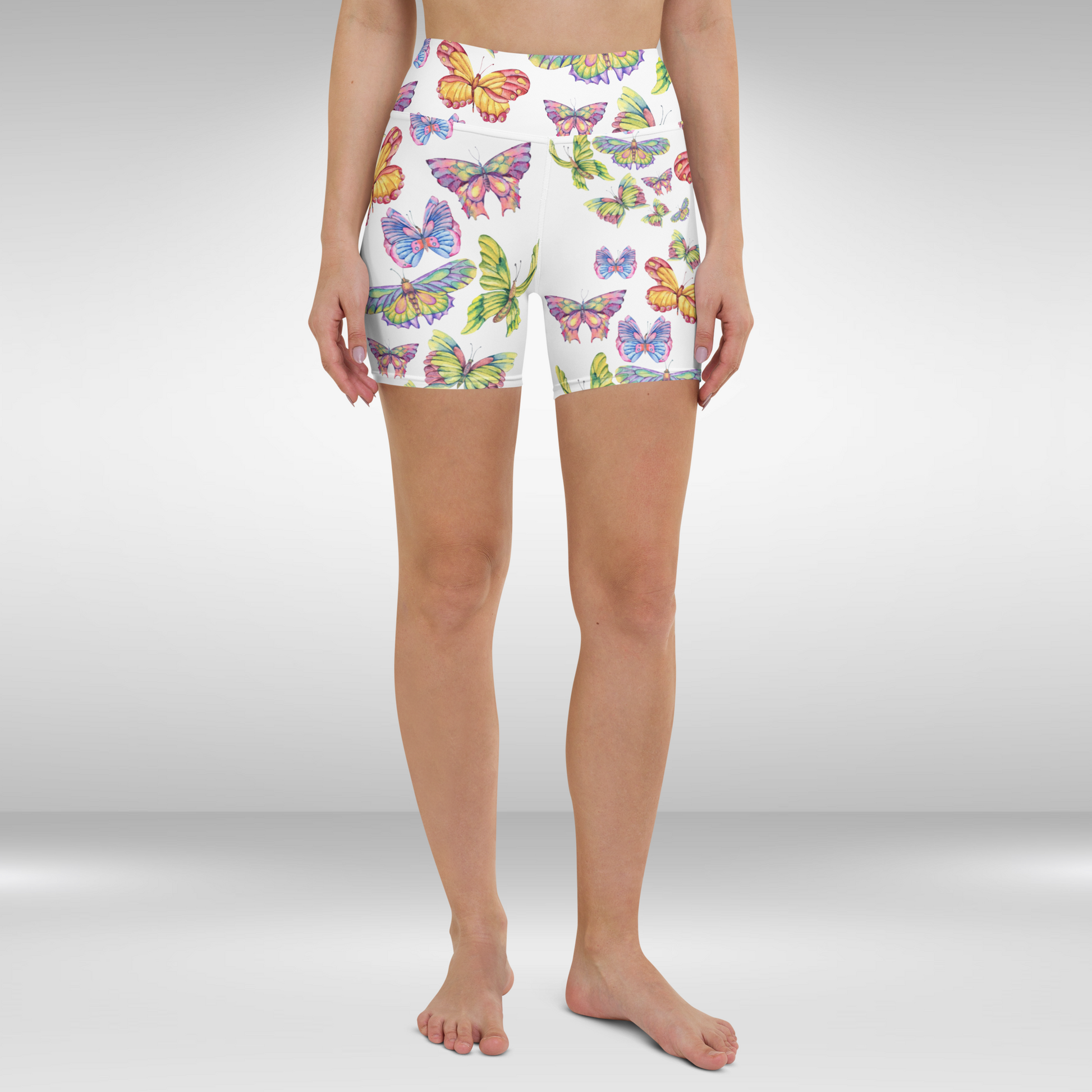 These Women's High Waist Shorts in White Butterfly Print are perfect for working out, with a flattering fit and comfy high waistband. Made from a soft blend of polyester and spandex, they also have a four-way stretch fabric for maximum comfort.