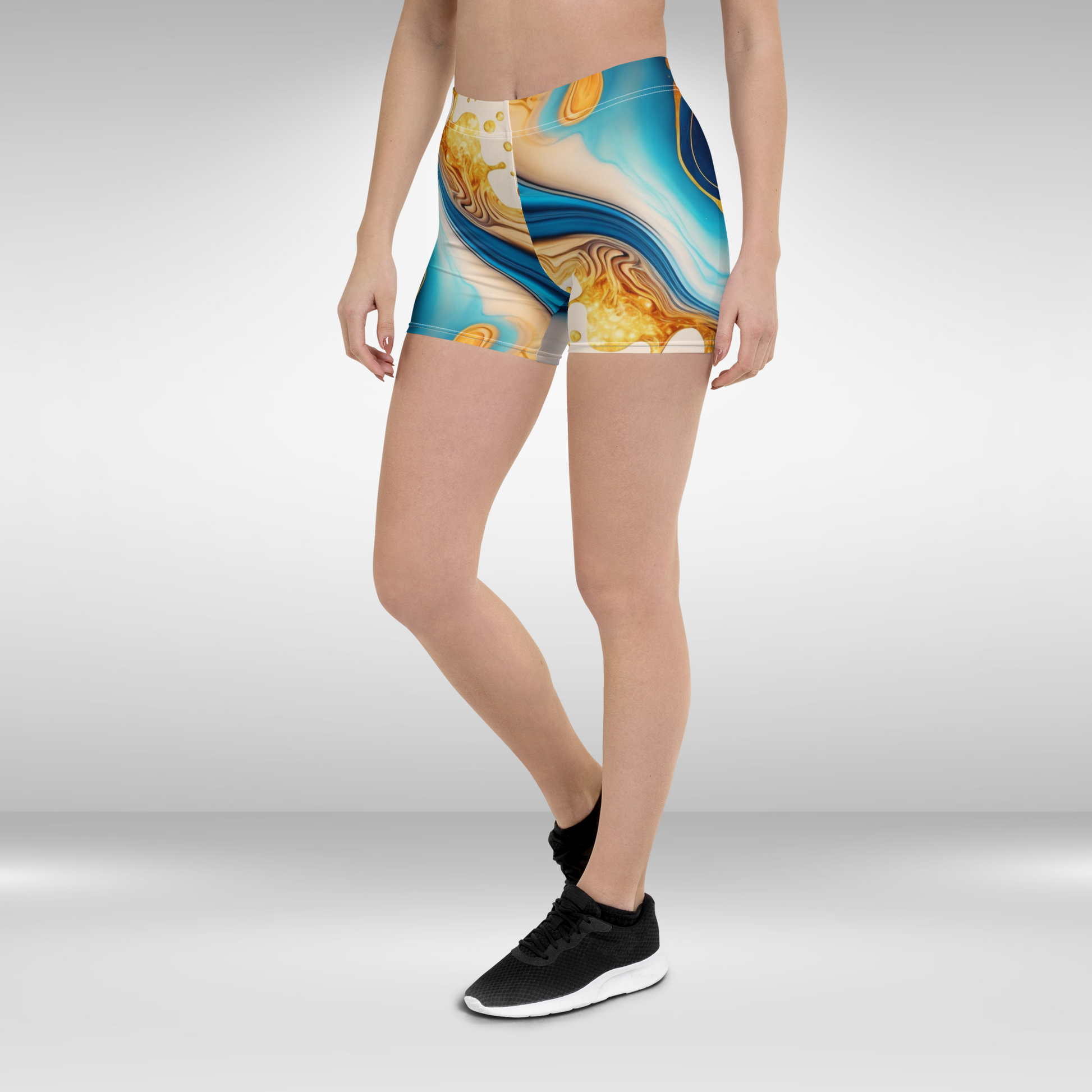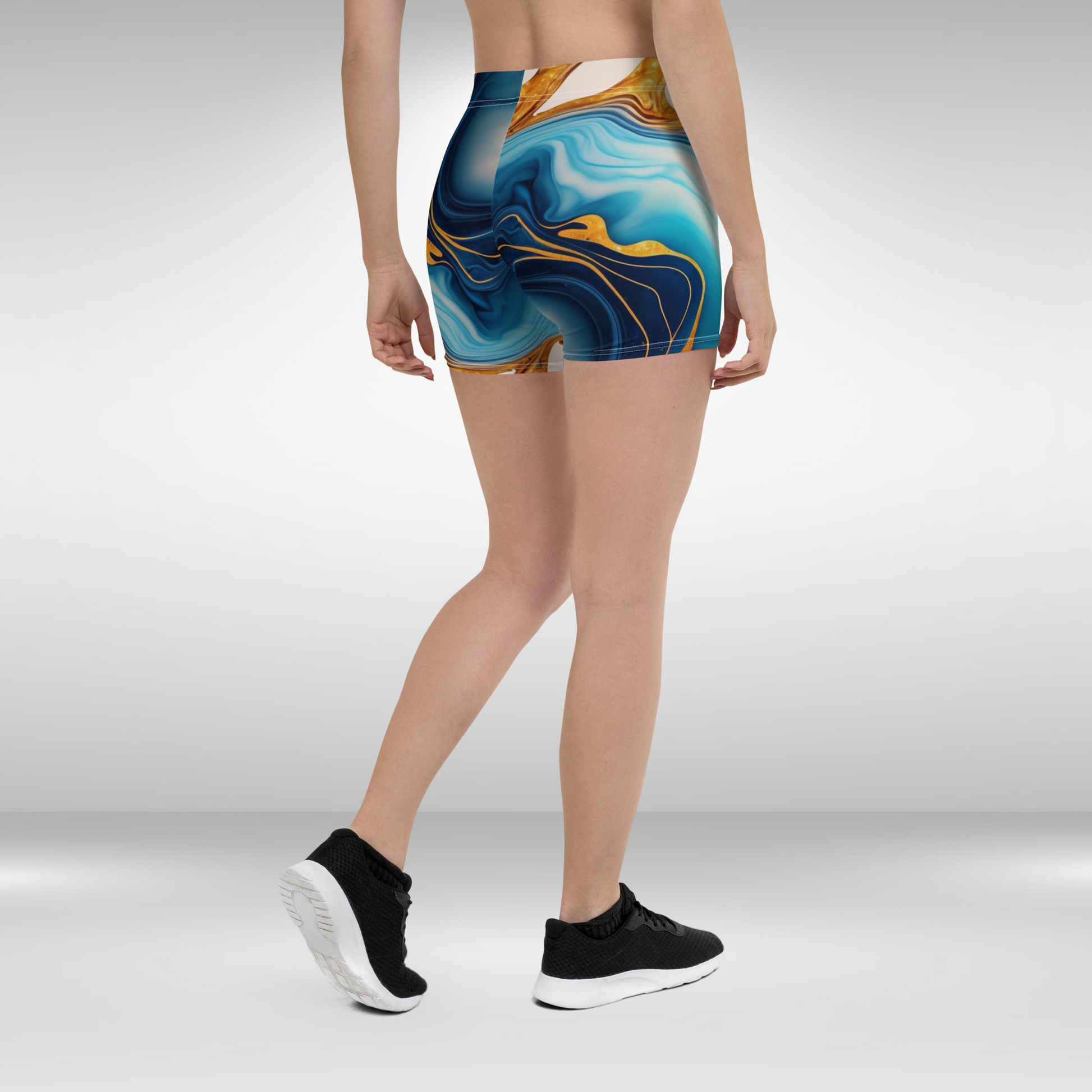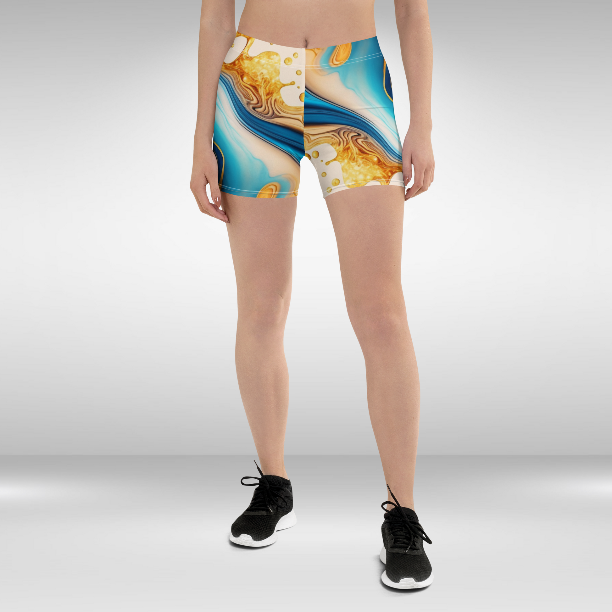 Women Mid Waist Shorts - Blue and Gold Abstract Print